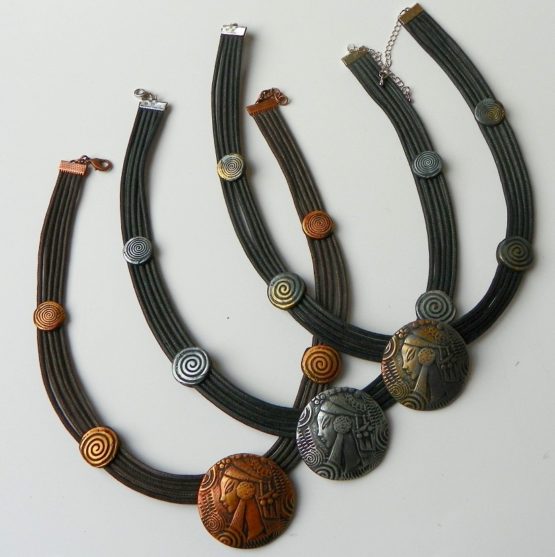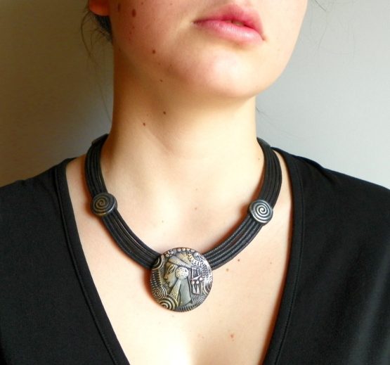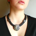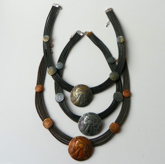 Nový typ náhrdelníku z kolekce Medieval. Ozdoby jsou vyrobené z polymerové hmoty, upevněné na pětinásobné bavlněné šňůrce, průměr prostřední ozdoby je 4 cm. Šňůrky jou poskládány tak, že leží vedle sebe a krásně sedí na krku. Délka cca 48 cm plus adjustační řetízek. S tímto výrazným náhrdelníkem vás nikdo nepřehlédne a budete překvapená jak je úžasně lehký, váží jen 22g. Vyrobím na objednávku do jednoho týdne.