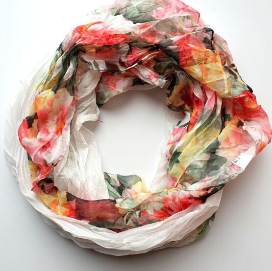Jemný nákrčník, směs silk touch polyester a viskoza rozměry 45×160 cm, lze obtočit 2x nebo 3x kolem krku. Šálá má z jedné strany krásný květinový vzor přecházející do jednolité barvy. Lze doplnit přívěsem z mojí nabídky.https://atelierkudlicka.cz/kategorie-produktu/privesy-na-nakrcniky/