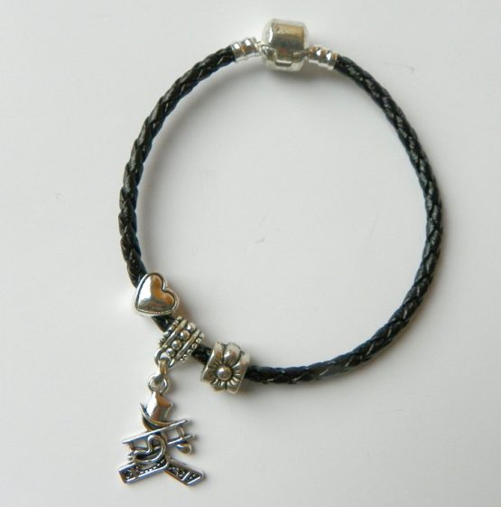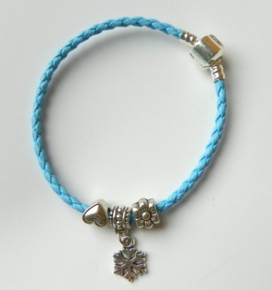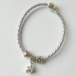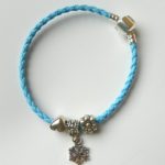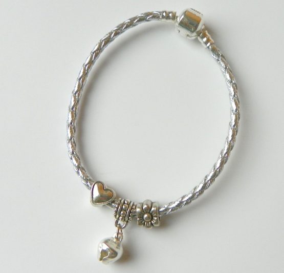 Jednoduchý náramek vyrobený z korálků a přívěsku z bižuterního kovu, které jsou navlečené na splétaném silikonovém řemínku se zapínáním na pantík. Délka cca 20-21 cm, odpovídá střednímu až štíhlejšímu zápěstí. Určitě s ním uděláte radost svým kamarádkám a kolegyním.