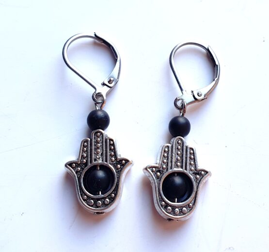 Náušnice ve tvaru ručičky-materiál bižuterní kov, korálek z přírodní lávy. Závěs do ucha je klapka z chirurgické oceli. Velikost ručičky je cca 15c10mm.