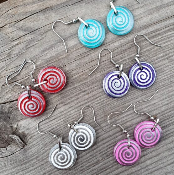 Náušnice s motivem spirály na barevném podkladu, průměr kolečka vyrobeného z polymerové hmoty je 12mm. Háček je z chirurgické oceli. Lze doplnit náhrdelníkem, náramkem nebo sponou na šálu z naší nabídky, motiv spirály je univerzální, najdete ho na spoustě našich výrobků. Náušnice jsou lehké na nošení.