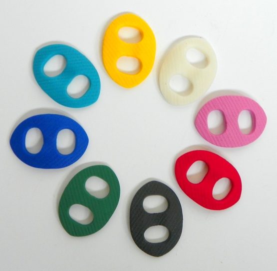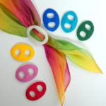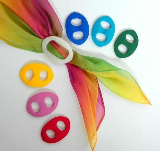 Oválná sponka nejenom na malý šáteček vyrobená z polymerové hmoty, rozměry cca 5×4 cm. Cípy šátku jednoduše prostrčíte proti sobě otvory ve sponě a zatáhnete. Šátek pak pěkně sedí na krku a nic se nerozvazuje. Sponku můžete použít i na větší šátek, tenkou velkou šálu nebo pareo. Jak sponku uvázat najdete zde http://atelierkudlicka.cz/jak-pouzit-sponky-na-satky-a-parea/