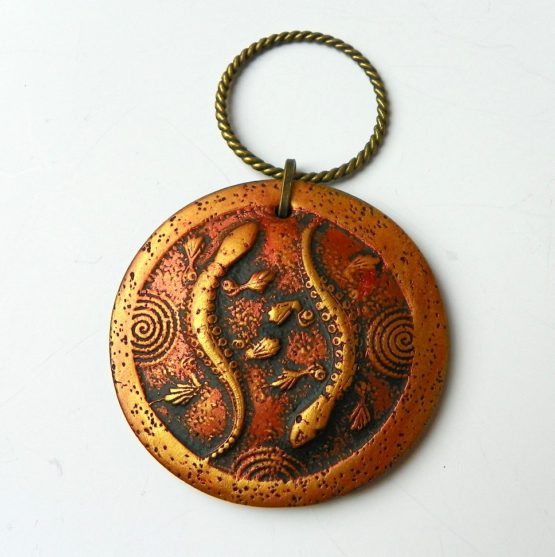 Spona na šálu je velice praktická pomůcka pro každou milovnici šál. Tento typ spony se hodí na pašmíny nebo podobné silnější typy šál. Pokud někdy nevíte jak šálu uvázat, nebo se vám uzel neustále rozvazuje, není nic jednoduššího než zapnout sponu v dolní části šály a pak už šálu jenom dvakrát omotat kolem krku. Spona na šálu je vyrobená z polymerové hmoty, průměr je cca 5,5 cm. Na spodní straně je opatřena gumičkou se americkým zapínáním, tzn. že kovovou tyčku prostrčíte celou kroužkem. Gumička pak šálu sepne. Ten to vzor je možný vyrobit na objednávku v různých barvách - stříbrné, měděné, modré nebo zelené.