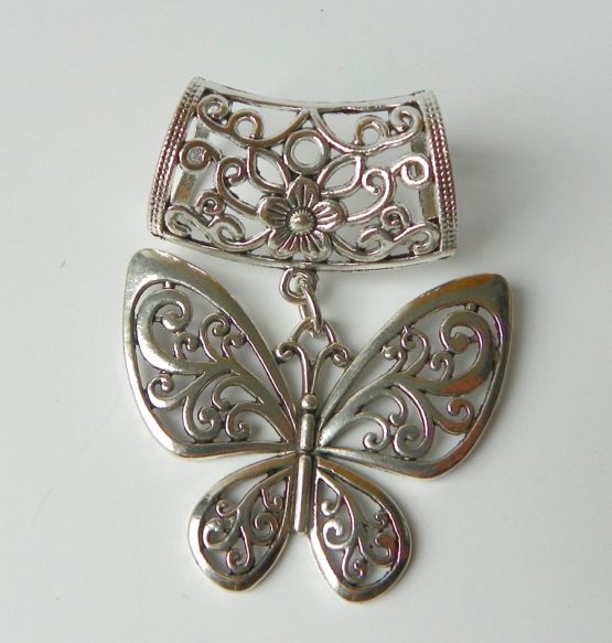 Pokud si chcete vyrobit vlastní šperkošálu, můžete použít tento přívěs na šály s motivem motýla. Úchytem jednoduše provlečete šálu, kterou pak omotáte kolem krku, vzadu překřížíte a konce necháte volně viset nebo je můžete ještě jednou provléct šálou směrem dovnitř. Rozměr úchytu je cca 3x2x2,5 cm, odpovídá slabší až středně silné šále. Velikost motýla je cca 6,5×4 cm, vše je ze stříbrného bižuterního kovu. Na konce šály můžete navléct korálky s velkým průvlekem, které také najdete v mojí nabídce. Poslední foto je orientační.