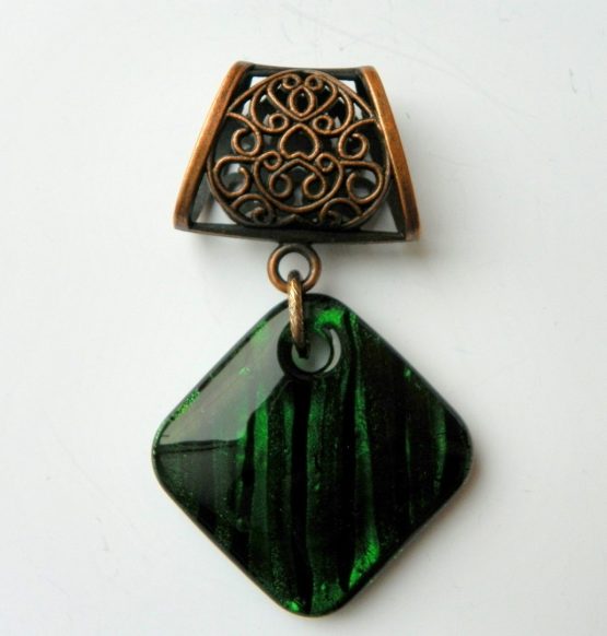 Elegantní doplněk na tenčí šálky s přívěsem z tmavězeleného vinutého skla. Úchytem jednoduše provlečete šálu, která pak omotáte kolem krku, vzadu překřížíte a konce necháte volně viset nebo je můžete ještě jednou provléct šálou směrem dovnitř. Rozměr úchytu je cca 3x2x2,5 cm. Přívěs je cca 4×4 cm. Úchyt je z měděného bižuterního kovu. Pokud nemáte vhodnou šálu, napište mi, ráda nějakou doporučím. Poslední foto je orientační.