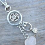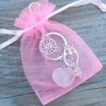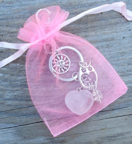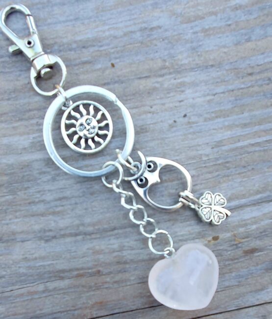 Přívěsek na klíče nebo na kabelku se srdíčkem z přírodního růženínu, sovičkou, sluníčkem a čtyřlístkem. Přívěsek je opatřený karabinou na zavěšení a dvojitým kroužkem na klíče. Zasíláme dárkově zabalené v organzovém sáčku.