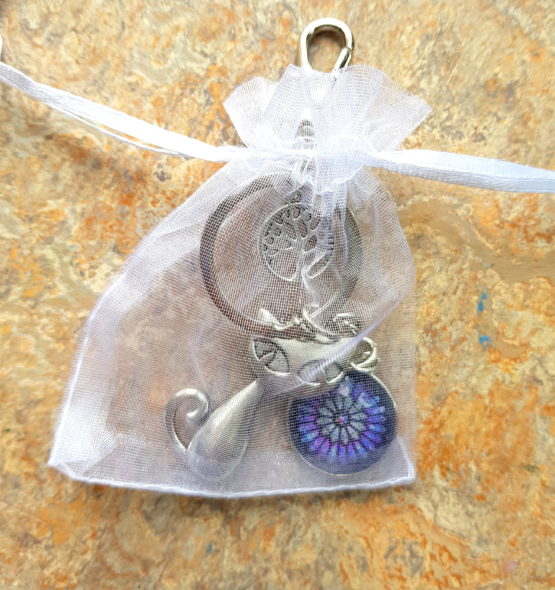 Klíčenka opatřená přívěsky se sovou, stromem života, sluncem a měsícem. Celková velikost cca 12 cm. Zasílám v dárkovém organzovém sáčku.