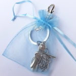 Přívěsek na kabelku nebo na klíče s motivem anděla. Velikost anděla je na výšku 9 cm, na šířku cca 4 cm. Andělka má karabinku na zavěšení, dále malé kovové přívěsky - čtyřlístek pro štěstí, hvězdičku, zvoneček nebo vánoční stromeček. Přívěsky zasílám zabalené do stahovacích organzových sáčků.