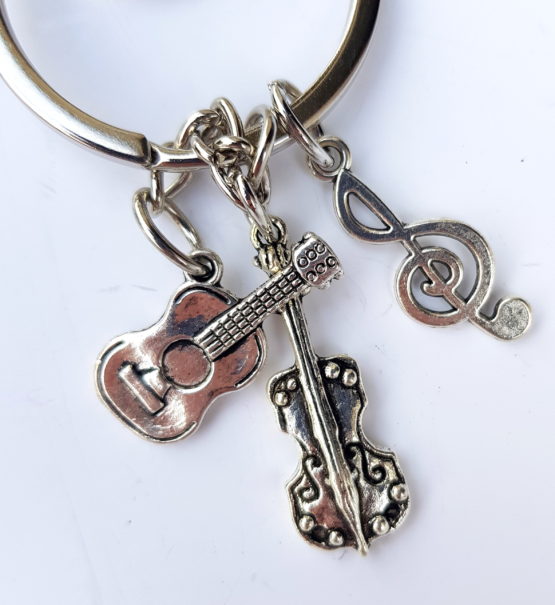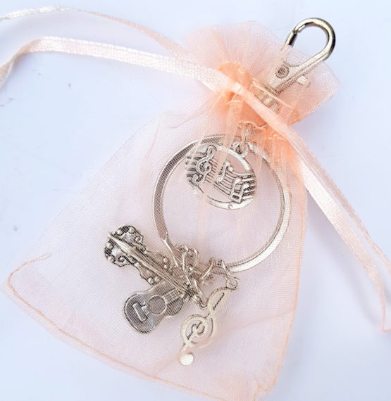 Přívěsek na kabelku nebo na klíče s motivem not, houslového klíče, kytary a housliček. Velikost přívěsku včetně karabiny je na výšku 10 cm. Krásný, drobný dárek pro všechny milovnice a milovníky hudby. Přívěsky zasíláme zabalené do stahovacích organzových sáčků, takže je můžete použít jako hotový dárek. Barvy sáčků se můžou lišit.