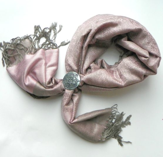 Krásná šedorůžová pašmína s jemným vzorem, s třásněmi, hebká a měkoučká, je doplněna sponou vyrobenou z polymerové hmoty. Délka šály je 170 cm, šířka cca 70 cm, průměr spony 5 cm. Spona je upevněna na gumičce a opatřena americkám zapínáním, které lehce zapnete a můžete použít i na jinou šálu. Je to praktický doplněk, sponu můžete nechat ve spodní části zapnutou a pak už jen šálu omotáte jednou nebo dvakrát kolem krku a nemusíte zavazovat. Materiál 90 procent kašmír, 10 procent hedvábí, prát ručně. Video jak lze sponu používat najdete v blogu.