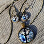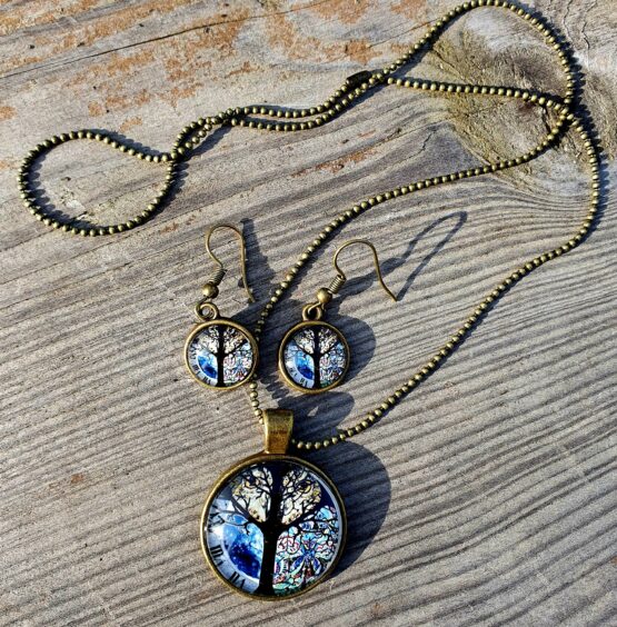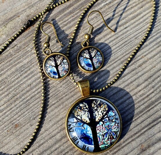 Sada skládající se z náhrdelníku a náušnic s motivem sovy. Materiál je bižuterní kov bez obsahu niklu a kadmia a skleněné kabošony s motivem sovy.