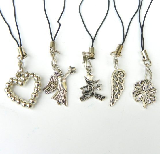 Sada pěti drobných přívěsků na mobil nebo peněženku, které se vždy hodí jako drobný dárek pro štěstí – kominík, andělíček, křídlo, srdíčko a čtyřlístek. Materiál je bižuterní kov a nylonová šňůrka s karabinkou.