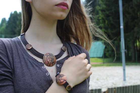 Luxusní kašmírová šála, ke které je vyrobena autorská sada - náhrdelník a spona na šálu. Vše je vyrobeno z polymerové hmoty, s motivem stromu. Náhrdelník je na kvalitním koženém řemínku s chirurgickým zapínáním, délka 45cm+5 cm řetízek. Spona je na spodní části opatřena gumičkou se zapínáním. Sepne se v doplní části šály, kde je nejlepší jí nechávat a šálu omotávat kolem krku. Šála je 90% kašmír, 10% hedvábí, s drobným vytkávaným vzorem, rozměr 70x180 cm.