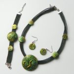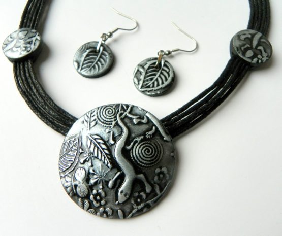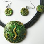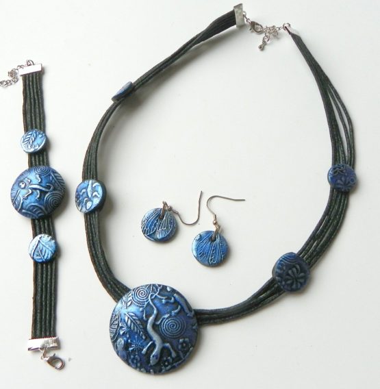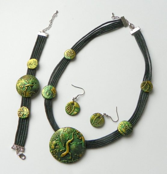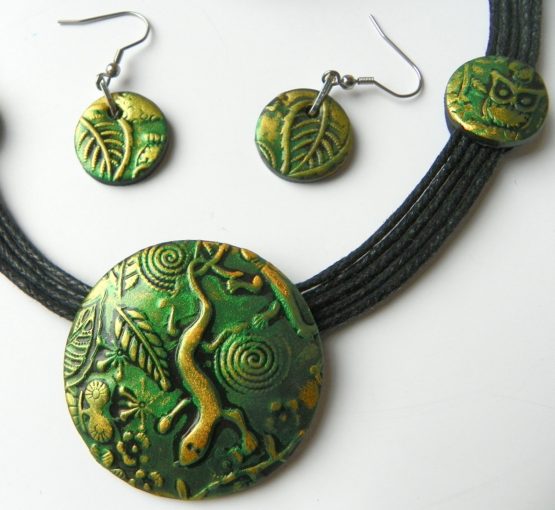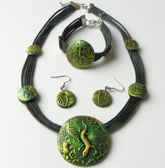 Velká sada z kolekce Medieval s motivem ještěrky a lesa. Sada se skládá z náhrdelníku o délce 44 cm plus adjustační řetízek, ozdoby z polymerové hmoty jsou upevněné na pěti bavlněných šňůrách, které jsou vytvarované tak aby pěkně seděly na na krku. Výhodou náhrdelníku je, že je velmi lehký i když vypadá masivně. Dále je v sadě náramek o délce 18 cm plus 5 cm adjustační řetízek a náušnice zavěšené na afroháčku. Celou sadu zasílám připevněnou na barevném kartonu s autorským razítkem. Sadu vyrobím na objednávku do 7 dnů.