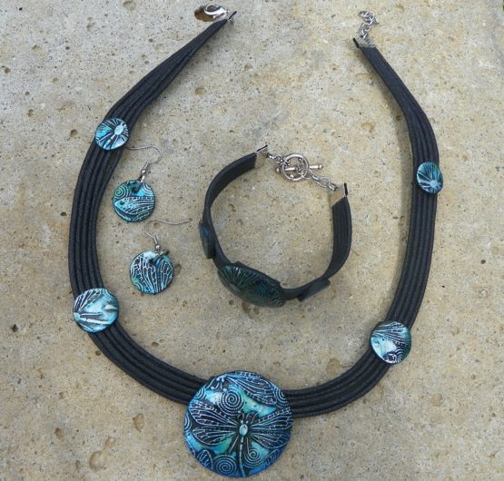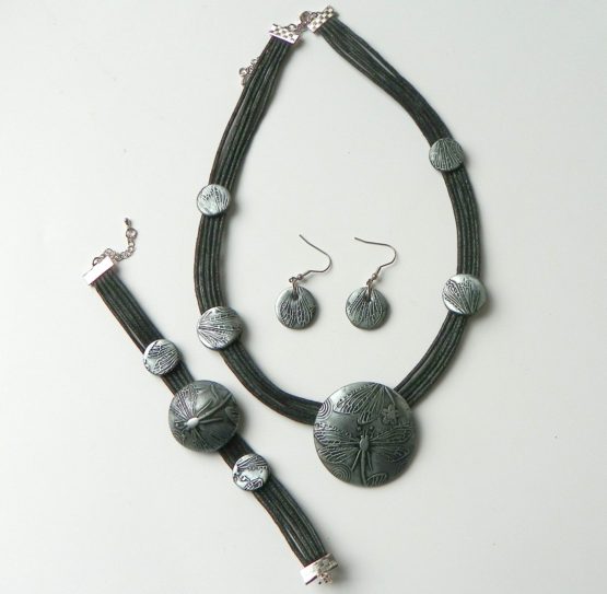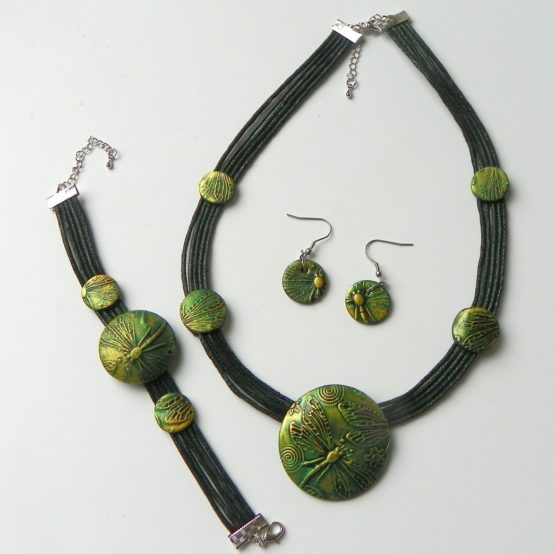 Velká sada z kolekce Medieval s motivem vážek. Sada se skládá z náhrdelníku o délce 44 cm plus adjustační řetízek, ozdoby z polymerové hmoty jsou upevněné na pěti bavlněných šňůrách, které jsou vytvarované tak aby pěkně seděly na na krku. Výhodou náhrdelníku je, že je velmi lehký i když vypadá masivně. Dále je v sadě náramek o délce 18 cm (je možné ho na požádání řetízkem prodloužit) a náušnice zavěšené na afroháčku. Celou sadu zasílám připevněnou na barevném kartonu s autorským razítkem. Sadu vyrobím na objednávku do 7 dnů.