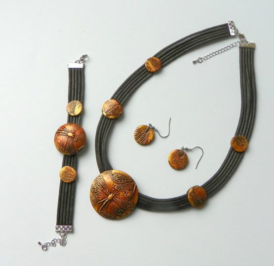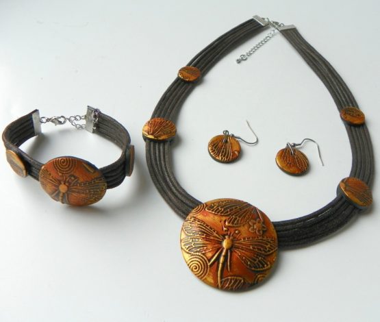Originální autorská sada s motivem vážek vyrobená z polymerové hmoty. Náhrdelník - délka 50 cm, průměr největšího kolečka je 4,5 cm, náramek - délka cca 18- 19 cm plus adjustační řežízek, náušnice - háčky z chirurgické oceli - průměr 2,5 cm (stejně tak i největší kolečko na náramku). Vyrobím na objednávku do týdne. Vzhledem k tomu, že je sada vyráběna na objednávku a je ručně patinovaná, může se barevnost v drobném detailu lišit. Prostě co kus to originál :)