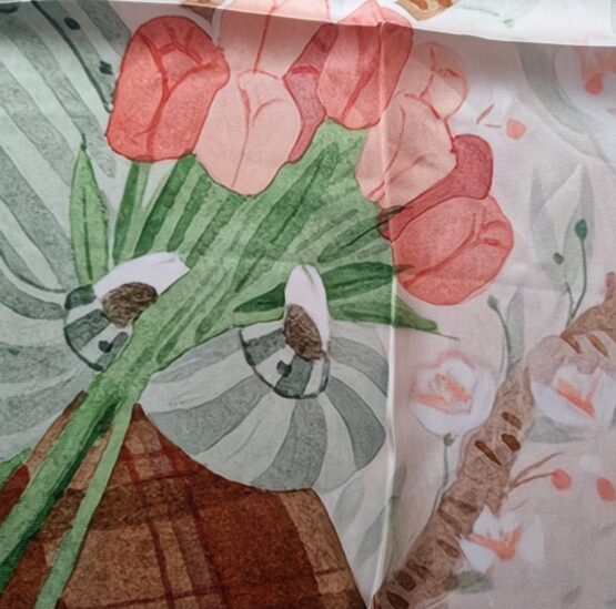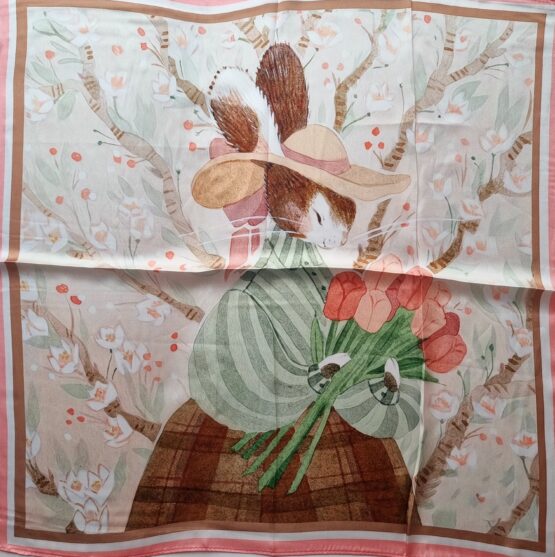 Luxusní šáteček o rozměrech 53×53 cm, materiál je velmi kvalitní a na dotyk příjemný silk touch polyester. Praní ručně, při nízké teplotě a velmi jemně, pak jen nechat vyvěsit, případně přežehlit přes mokrý ručník.