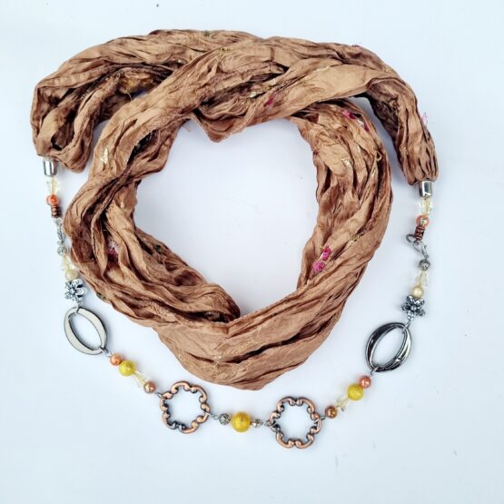 Elegantní a originální doplněk do šatníku každé ženy, která ráda zaujme své okolí. Náhrdelník je uvázaný ze šátku o rozměrech 60x60, délka náhrdelníku je cca 60 cm a je možné jí upravit pomocí uzlíků. Šátek je směs polyester a hedvábí. Náhrdelník je doplněný přívěsem z bižuterního kovu, rozměr přívěsku cca 3 cm. Pokud budete šátek prát, lehce z něj přívěs i korálky po rozvázání uzlíků sundáte. Přívěs můžete použít i na jiný šátek nebo šálu. Barevný doplněk, který rozzáří všechny šedé dny a trochu zahřeje.