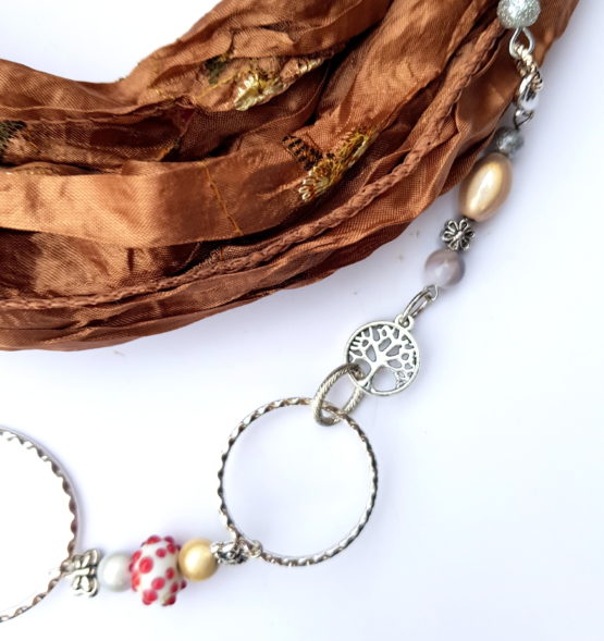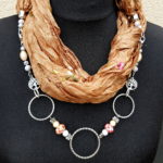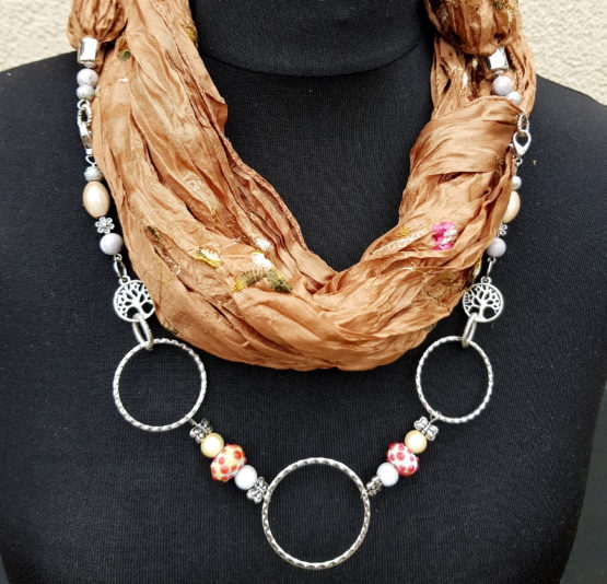 Elegantní a originální doplněk do šatníku každé ženy, která ráda zaujme své okolí. Na splývavé měkké šále 70×80 cm, směs hedvábí a polyester, je dvěma karabinami připevněn náhrdelník vyrobený z korálků o délce cca 45cm. Korálky jsou oboustranné. Šálu jednou omotáte okolo krku a na cípy připnete náhrdelník, při troše cviku zvládnete vše i bez rozepínání karabin. Šálu prát ručně, samozřejmě bez náhrdelníku. K šátkošperku si můžete zakoupit řetízek, na který můžete korále zavěsit a nosit je i bez šály..