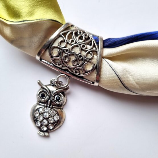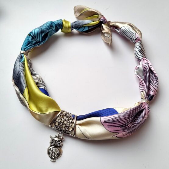 Elegantní a originální doplněk do šatníku každé ženy, která ráda zaujme své okolí. Náhrdelník je uvázaný ze šátku o rozměrech 60×60, délka náhrdelníku je cca 60 cm a je možné jí upravit pomocí uzlíků. Šátek je směs polyester a hedvábí. Náhrdelník je doplněný přívěsem z bižuterního kovu. Rozměr přívěsku cca 3 cm. Pokud budete šátek prát, lehce z něj přívěs i korálky po rozvázání uzlíků sundáte. Přívěs můžete použít i na jiný šátek nebo šálu. Barevný doplněk, který rozzáří všechny šedé dny a trochu zahřeje.