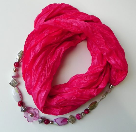 Elegantní a originální doplněk do šatníku každé ženy, která ráda zaujme své okolí. Na splývavé měkké šále 70×80 cm, směs hedvábí a polyester, je dvěma karabinami připevněn náhrdelník vyrobený z korálků o délce cca 45cm. Korálky jsou oboustranné. Šálu jednou omotáte okolo krku a na cípy připnete náhrdelník, při troše cviku zvládnete vše i bez rozepínání karabin. Šálu prát ručně, samozřejmě bez náhrdelníku. K šátkošperku si můžete zakoupit řetízek, na který můžete korále zavěsit a nosit je i bez šály.. http://atelierkudlicka.cz/obchod/retizek-k-satkosperku-2/