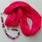 Elegantní a originální doplněk do šatníku každé ženy, která ráda zaujme své okolí. Náhrdelník je uvázaný ze šátku o rozměrech 60x60, délka náhrdelníku je cca 60 cm a je možné jí upravit pomocí uzlíků. Šátek je směs polyester a hedvábí. Náhrdelník je doplněný přívěsem z bižuterního kovu a přírodního kamene. Rozměr přívěsku cca 3 cm. Pokud budete šátek prát, lehce z něj přívěs i korálky po rozvázání uzlíků sundáte. Přívěs můžete použít i na jiný šátek nebo šálu. Barevný doplněk, který rozzáří všechny šedé dny a trochu zahřeje.