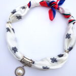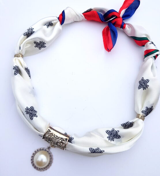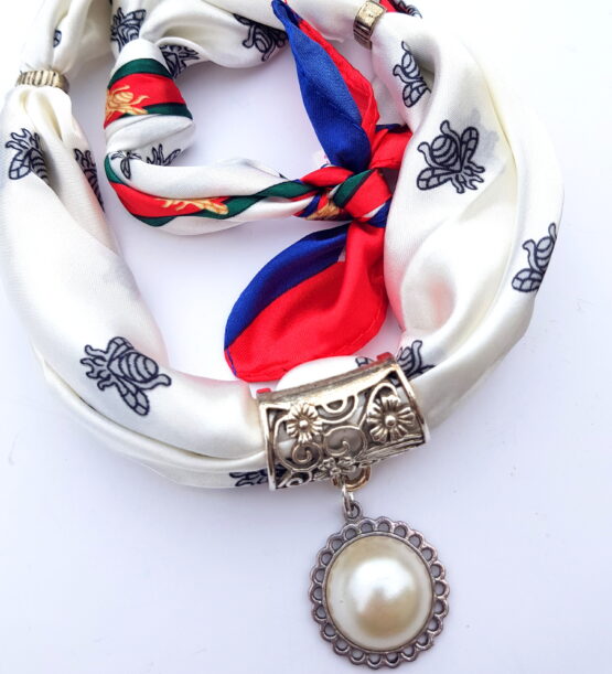 Elegantní a originální doplněk do šatníku každé ženy, která ráda zaujme své okolí. Náhrdelník je uvázaný ze šátku o rozměrech 60×60, délka náhrdelníku je cca 60 cm a je možné jí upravit pomocí uzlíků. Šátek je směs polyester a hedvábí. Náhrdelník je doplněný přívěsem z bižuterního kovu, rozměr přívěsku cca 3 cm. Pokud budete šátek prát, lehce z něj přívěs i korálky po rozvázání uzlíků sundáte. Přívěs můžete použít i na jiný šátek nebo šálu. Barevný doplněk, který rozzáří všechny šedé dny a trochu zahřeje.