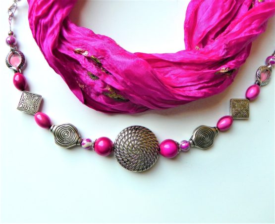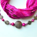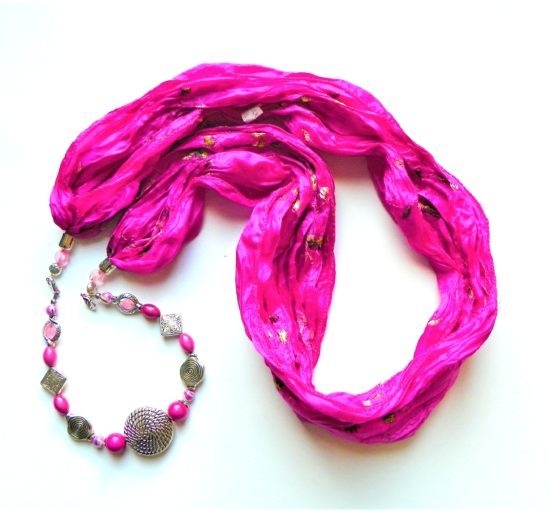 Elegantní a originální doplněk do šatníku každé ženy, která ráda zaujme své okolí. Na splývavé měkké šále 70×80 cm, směs hedvábí a polyester, je dvěma karabinami připevněn náhrdelník vyrobený z korálků o délce cca 45cm. Korálky jsou oboustranné. Šálu jednou omotáte okolo krku a na cípy připnete náhrdelník, při troše cviku zvládnete vše i bez rozepínání karabin. Šálu prát ručně, samozřejmě bez náhrdelníku. K šátkošperku si můžete zakoupit řetízek, na který můžete korále zavěsit a nosit je i bez šály.. http://atelierkudlicka.cz/obchod/retizek-k-satkosperku-2/