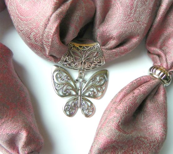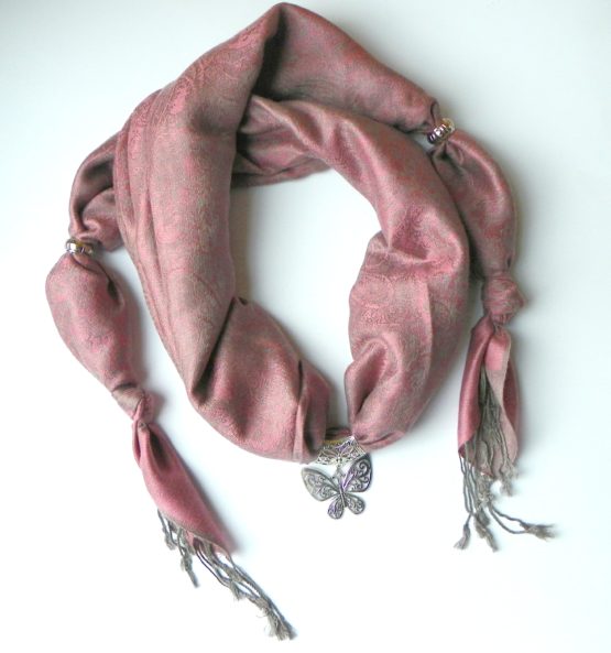 Měkoučká a jemná pašmína o rozměrech 70×170, která je šikovně stočená a nakonci jsou uvázány uzlíky. Uprostřed šály je navlečen přívěs vyrobený ze stříbrného bižuterního kovu. Velikost motýla je cca 6×5 cm. Po stranách šály jsou navlečeny korálky. Přívěs a korálky je možné po rozvázání uzlíků, které jsou na konci šály, sundat a případně přendat na jinou šálu. Průvlek je velký cca 4x3cm. Elegantní doplněk do šatníku každé ženy, která se nebojí zdobit.