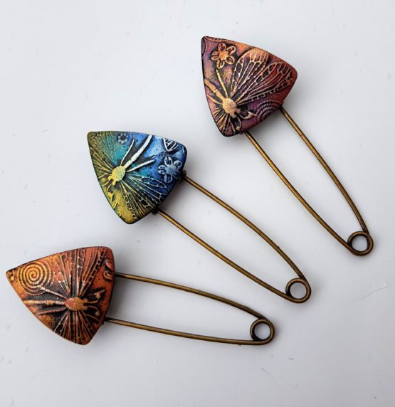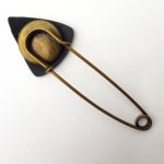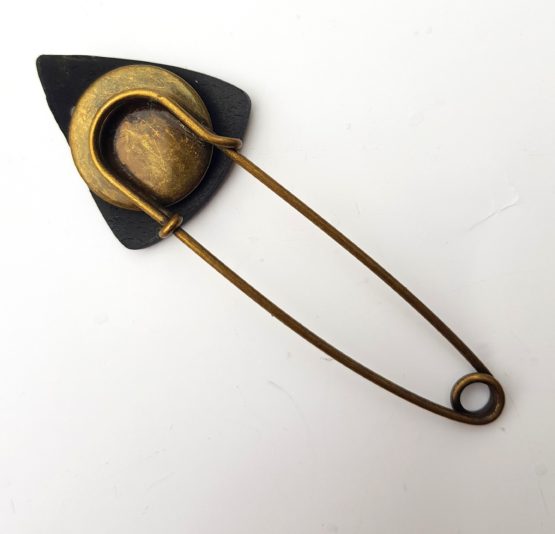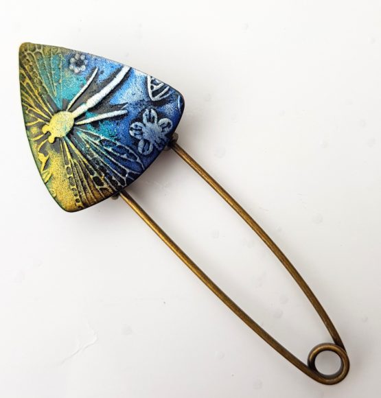 Spínací špendlík s autorskou ozdobou z naší dílny. Slouží k sepnutí ponča, svetru nebo vesty bez knoflíků, nebo jenom jako ozdobná brož. Velikost špendlíku je cca 8 cm, velikost ozdobného trojuhelníku je cca 2,5 cm.