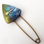 Spínací špendlík s autorskou ozdobou z naší dílny. Slouží k sepnutí ponča, svetru nebo vesty bez knoflíků, nebo jenom jako ozdobná brož. Velikost špendlíku je cca 8 cm, průměr ozdobného terčíku 2cm.