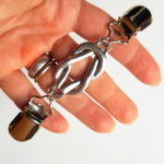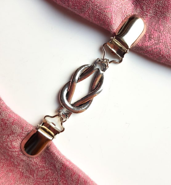 Spínací klip na svetr bez knoflíků nebo pončo. Z každé strany je opatřený kšandovým klipem, kterým sepnete obě části svetru, vyrobeno ze stříbrného bižuterního kovu. Celková délka cca 12 cm.