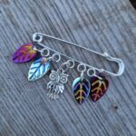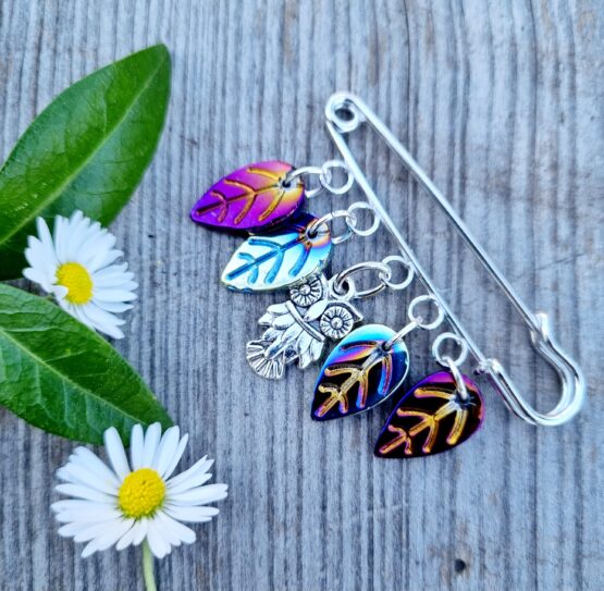 Spínací špendlík ozdobený skleněnými a kovovými komponenty – lístky a sovičkou. Délka cca 6cm. Na sepnutí kardiganu, ponča, nebo jenom jako ozdoba. Vhodný jako malý dárek pro paní učitelku.