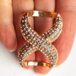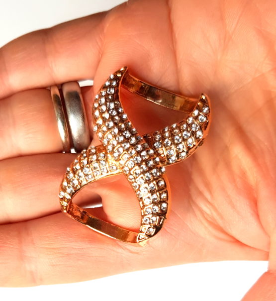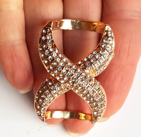 Kovová sponka ze zlatého bižuterního kovu, zdobená blýskavými kamínky, určená k provlékání cípů šátku nebo tenké šály. Velikost je 3×4 cm. Cípy můžete provlékat proti sobě, nebo spojku nasunout na oba cípy stejným směrem.