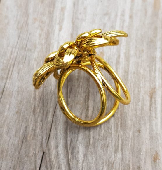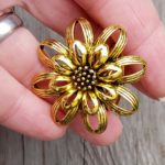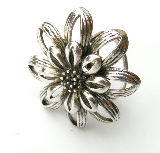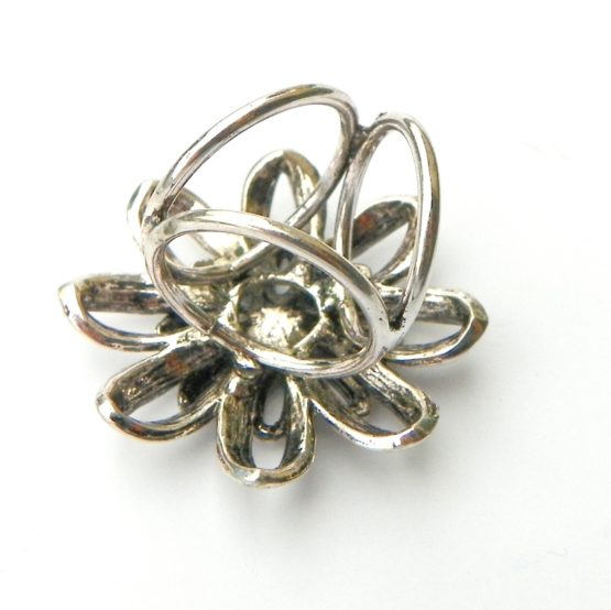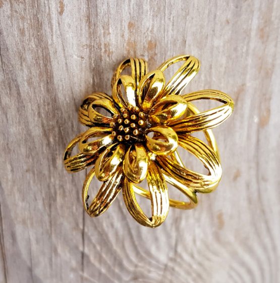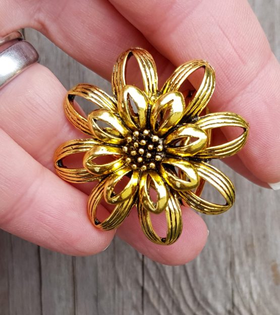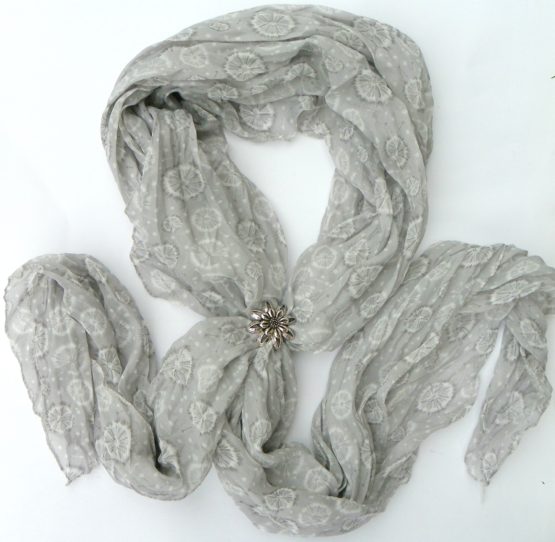 Kovová sponka na šálu ve tvaru kytičky, na spodní straně opatřená třemi kroužky, do kterých můžete šálu různě provlékat. Fantazii se meze nekladou, základní provlékání je – každý cíp do jednoho kroužku a pak společně do třetího – tím šálu krásně spojíte. Foto se šálou je pouze ilustrační.