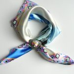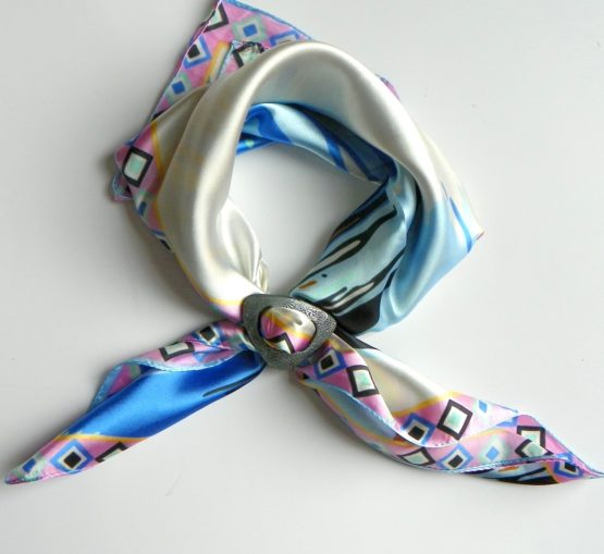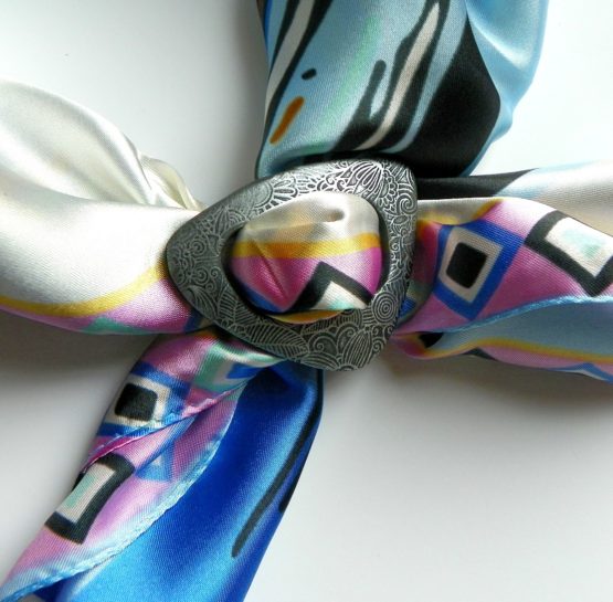 Spona nejenom na malý šáteček vyrobená z polymerové hmoty, ozdobená jemným metalickým dekorem, rozměry cca 5x4 cm. Cípy šátku jednoduše prostrčíte proti sobě otvory ve sponě a zatáhnete. Šátek pak pěkně sedí na krku a nic se nerozvazuje. Sponku můžete použít i na větší šátek, tenkou velkou šálu nebo pareo.