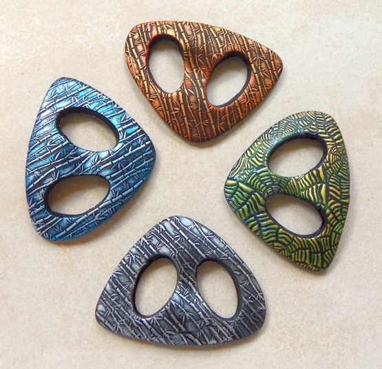 Trojúhelníková spona nejenom na malý šáteček vyrobená z polymerové hmoty, ozdobená jemným metalickým dekorem, rozměry cca 5×4 cm. Cípy šátku jednoduše prostrčíte proti sobě otvory ve sponě a zatáhnete. Šátek pak pěkně sedí na krku a nic se nerozvazuje. Sponku můžete použít i na větší šátek, tenkou velkou šálu nebo pareo. Jak sponku uvázat najdete zde http://atelierkudlicka.cz/jak-pouzit-sponky-na-satky-a-parea/