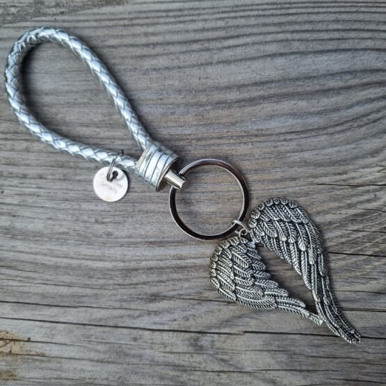Klíčenka se zaplétaným stříbrným držadlem, dvěma kroužky na klíče a přívěskem s andělskými křídly. Celková délka je cca 19 cm. Tato klíčenka je vhodná pro všechny, kdo neustále hledají klíče. Tato klíčenka není zabalena v dárkovém organzovém sáčku.