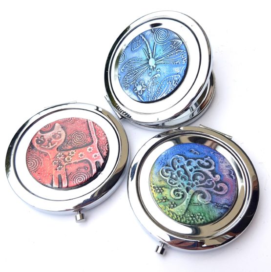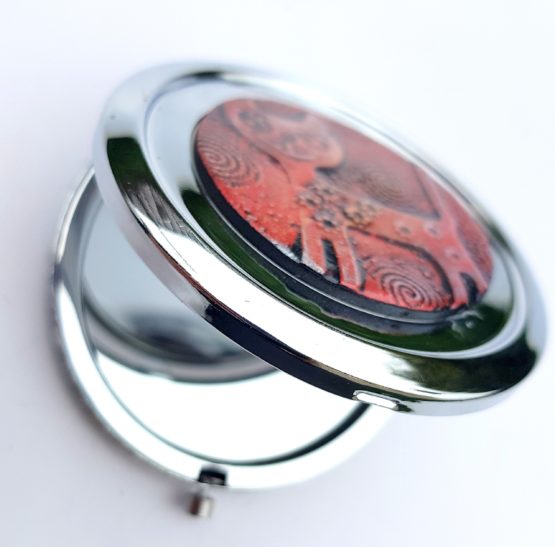 Zrcátko do kabelky ozdobené autorským motivem z naší dílny. Uvnitř otevíracího pouzdra je zvětšovací a obyčejné zrcátko, průměr 7,5. Milý dárek, který potěší třeba někoho kdo nenosí šperky ani šály.